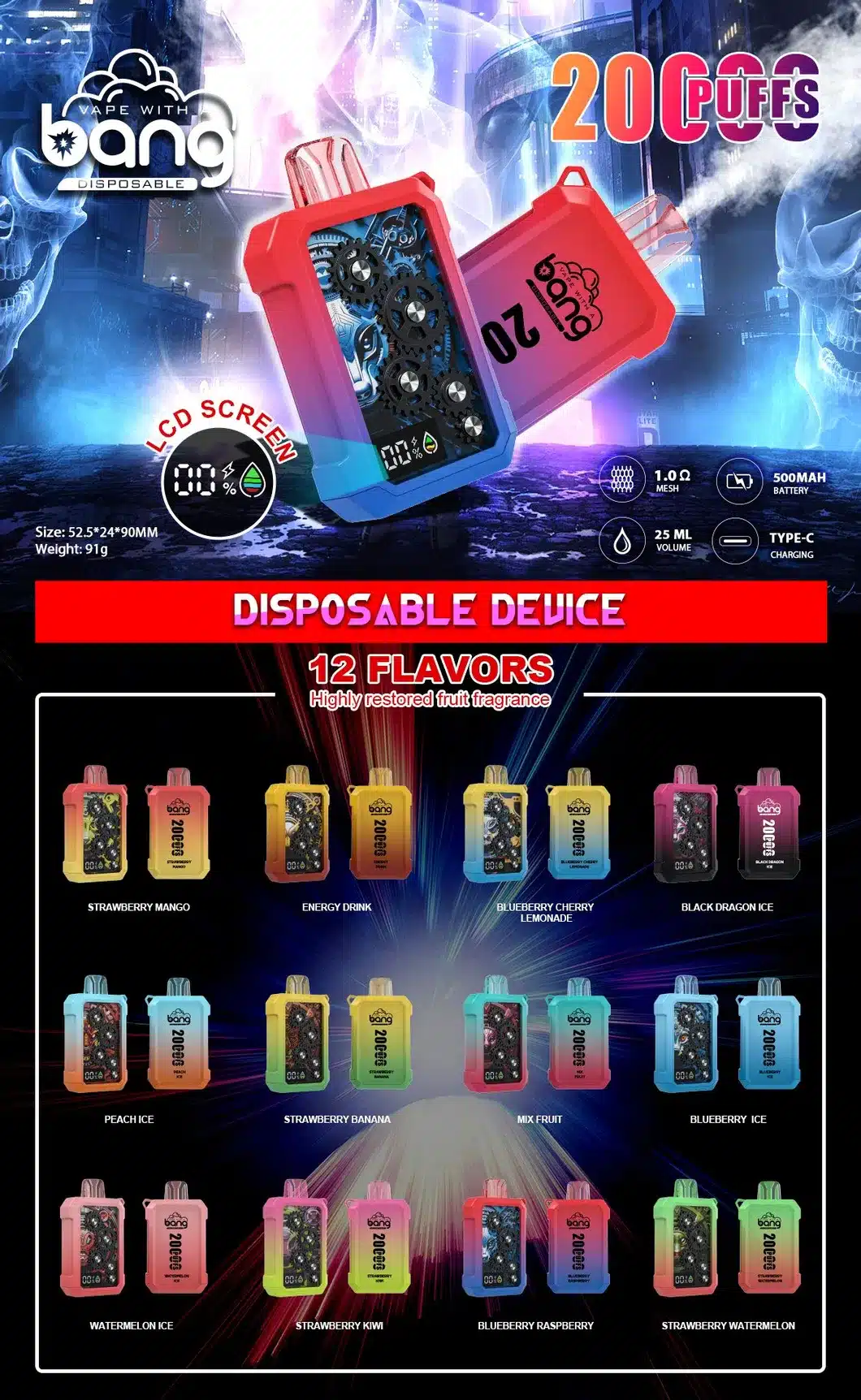 BANG WHEEL 20000口對於喜歡多變口感、又追求長效續航的玩家來說,是一次性電子煙中的高端之選,一支就能滿足雙倍味覺需求,透明油倉與 LED 螢幕設計增加使用便利性與安全性。