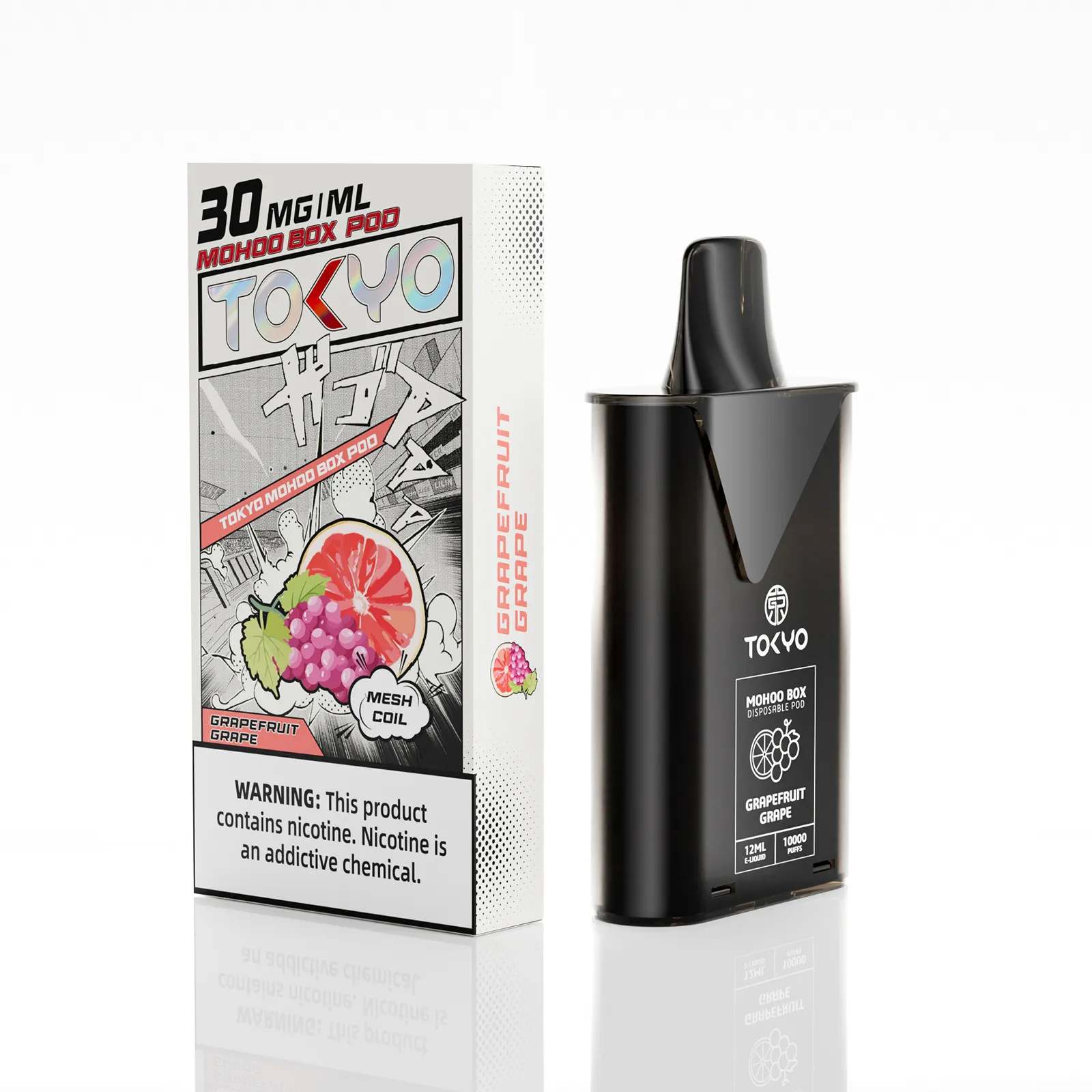 東京魔盒電子煙煙彈採用植物甘油與丙二醇基底,搭配高純度尼古丁鹽,容量 12mL、尼古丁強度 30mg/mL(3%),內建 1.0Ω 鋼網棉霧化芯,設計為一次性 pod,約可在 10,000 口,吸引力持久。